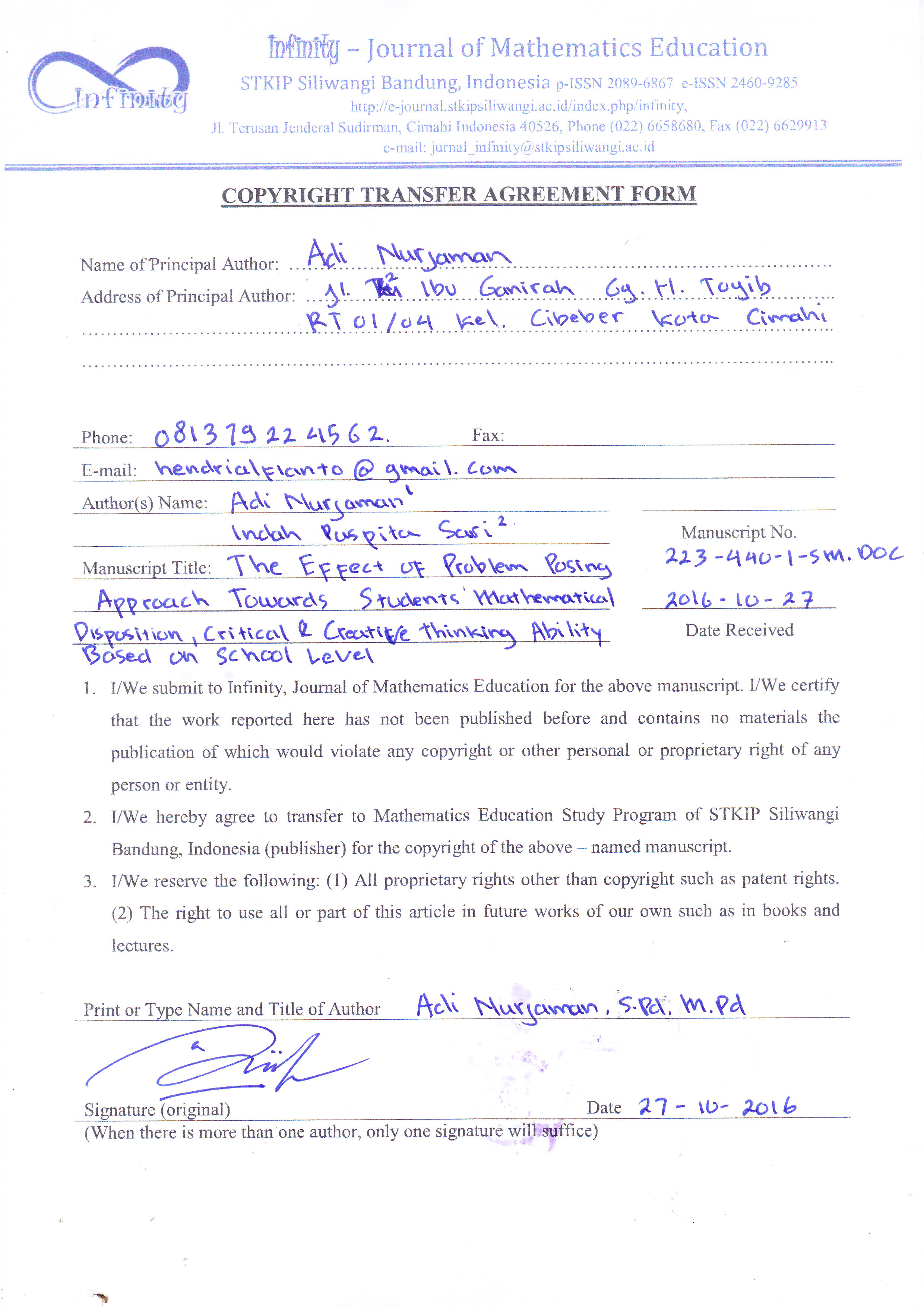 Sugilar, H. (2013). Meningkatkan Kemampuan Berpikir Kreatif dan Disposisi Matematik Siswa Madrasah Tsanawiyah Melalui Pembelajaran Generatif. Infinity, 2(2), 156-168.