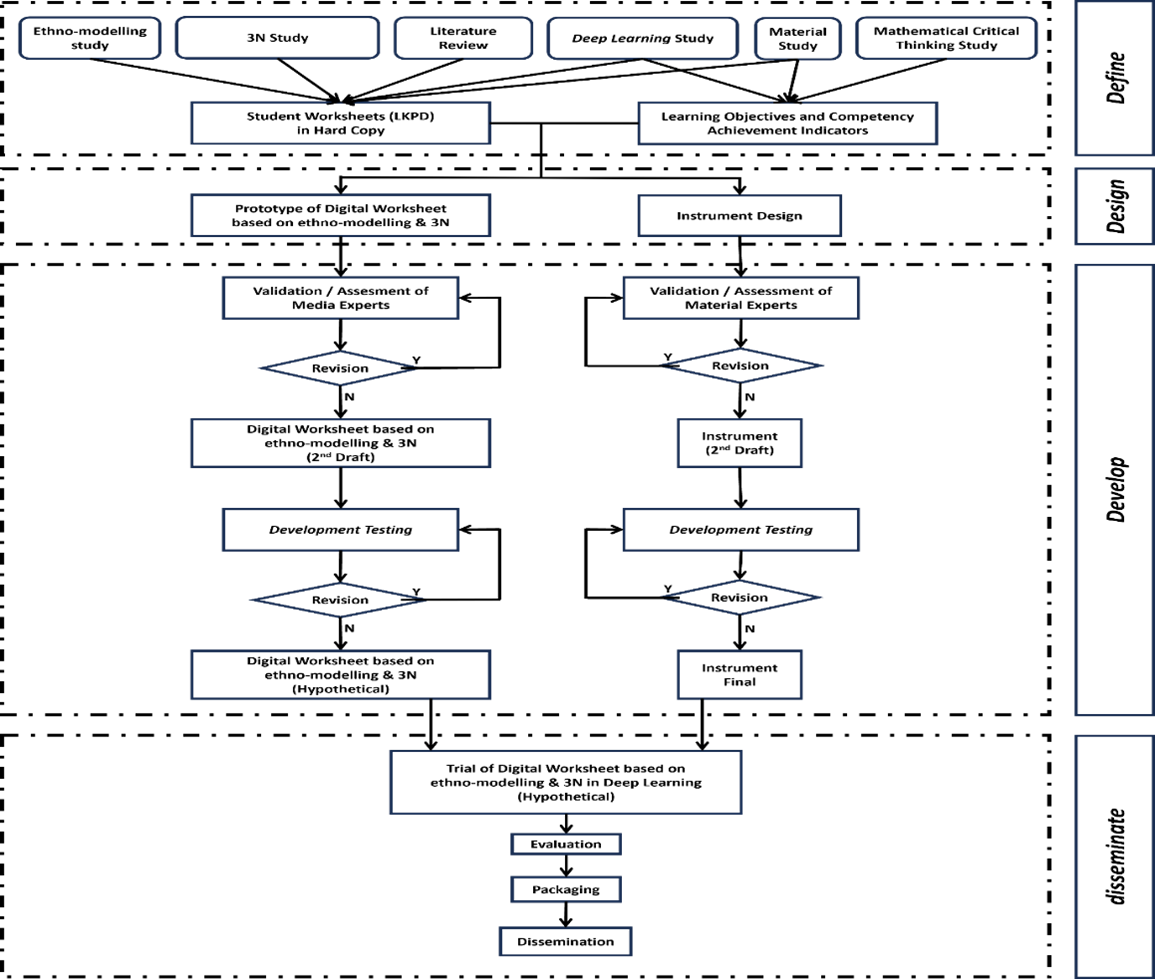 Technological developments require teachers to innovate, including the digitalization of Student Worksheets (LKPD) to facilitate joyful, meaningful learning for students. The urgency of this study stems from the need for flexible digital teaching tools (online and offline) and for easy access to information. This study aims to develop a Digital Worksheet model based on Ethno-Modelling and 3N (Niteni, Nirokke, Nambahi). This development research uses the 4D model (Define, Design, Develop, and Disseminate) and draws on subjects from two provinces (D.I. Yogyakarta and West Java) representing seven districts/cities. Small tests were given to 20 students from the Greater Bandung area and 25 students from the D.I. Yogyakarta province. Field tests were conducted with 179 students across seven schools in the D.I. Yogyakarta and West Java provinces. The results of the study indicate that the digital worksheet based on Ethno-Modelling and 3N developed is valid and can be used without revision, with a combined percentage of 93.33%. The results of a small test based on student responses (90.40%) indicate that the digital worksheet design based on Ethno-Modelling and 3N (EM3N) received strong responses, making it very practical to use. The results of the field test show that the achievement of mathematical critical thinking skills among students who learn using digital worksheets has a very large effect size, as measured by Cohen's d (d > 0.80). This finding provides a positive impact that digital worksheets designed based on the integration of ethno-modelling and 3N (EM3N) that align learning with the cultural context can strengthen curriculum concepts and enhance students' mathematical critical thinking skills.